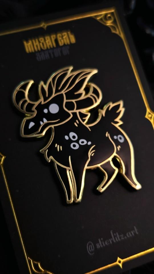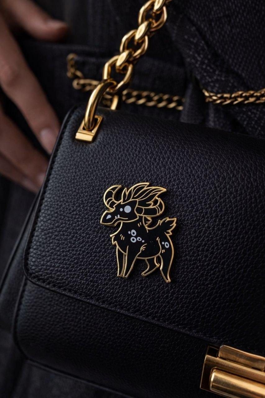 Златорог - существо с характером, сильное и грозное! Сможешь поладить с ним и у тебя будет верный карманный спутник Металлическая брошь, высотой 4,5 см Две резиновых застежки на металлических штырях на обратной стороне